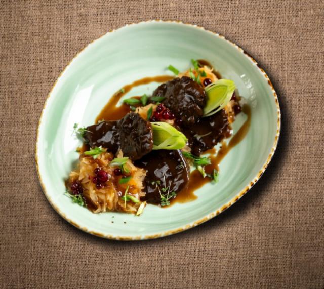菜是精煮鹿肉配越橘醬和燉酸菜。